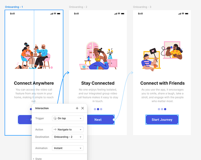 Figma will analyze your design and will create transitions between screens. If you have a simple design (like the one from my example), you will likely see a simple On click — Navigate to transitions. But for a more complex design, you will see back-and-forth transitions between states.